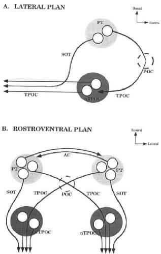 A: Lateral plan of Xenopus forebrain. The SOT arises from a small cluster of cell bodies with in the presumptive telencephalon, whilst the SOT arises from a small cluster of cell bodies within the presumptive telencephalon, whilst the TPOC arises from axons within both the contralateral presumptive telencephalon and the nucleus of the tract of the post-optic commissure.