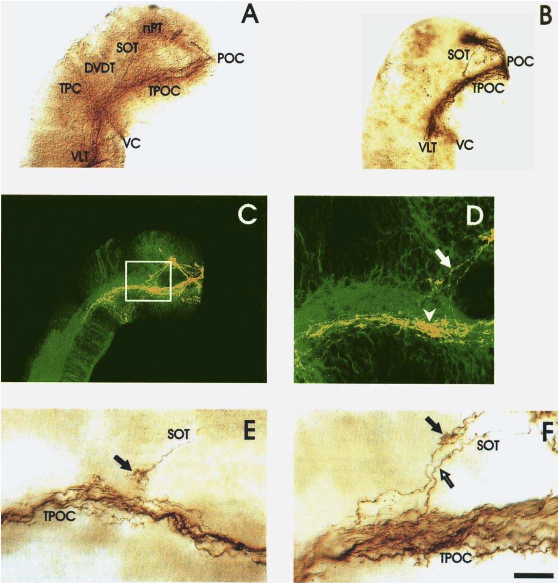 F: Later following axons (at late stage 32) grow either individually (open arrow) or along pioneering axons (closed arrow) to form fascicles. Caudal (left); ventral (down). DVDT, dorsoventral dlencephalic tract; nPT, nucleus of the presumptive telencephalon; POC, post-optic commissure; SOT, su- pra-optic tract; TPC, tract of the posterior commissure; TPOC, tract of the post-optic commissure; VC, ventral commissure; VLT, ventral longitudlnal tract. Bar: 150 um (C), 100 um (A-B), 75 um (D), 50 um (E), 25 um (F).