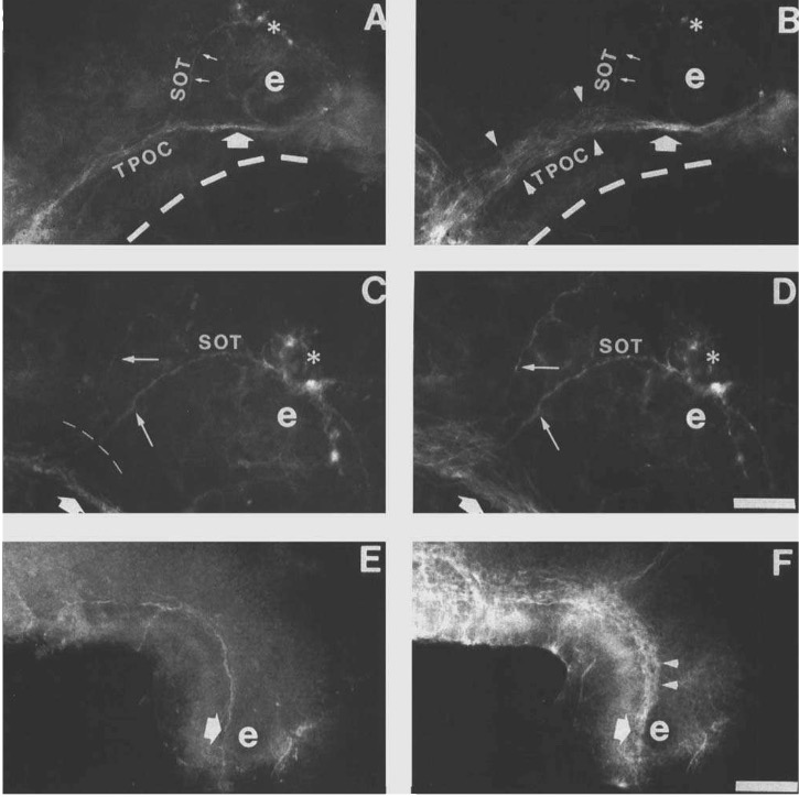 C and D: Higher magnification of views A and B, respectively. Both axons in the SOT at this stage express NOC-1 ( thin arrows). The dashed line in C represent the dorsal limit of the TPOC ( large arrows) as determined by acetylated- alpha-tubulin expression in D. The NOC-1 positive SOT axons grow ventrally past axons in the dorsal TPOC and only turn and grow caudally after contacting NOC-1 positive axons in the ventral TPOC. E: At stage 28, prior to the formation of the SOT, NOC-1 expressing axons in the TPOC course as a single discrete bundle throughout its entire course (large arrow). The rostral surface of the prosencephalon is towards the bottom of the panel. F: Acetylated-a-tubulin expression in the same an- imal as E. There are many axons in the dorsal TPOC which do not express NOC-1 at this stage. These axons defasciculate and are present in the dorsal regions of the TPOC caudal to the eye vesicle (arrowheads). Bar: 100 pm (E-F); 50 pm (A-D).