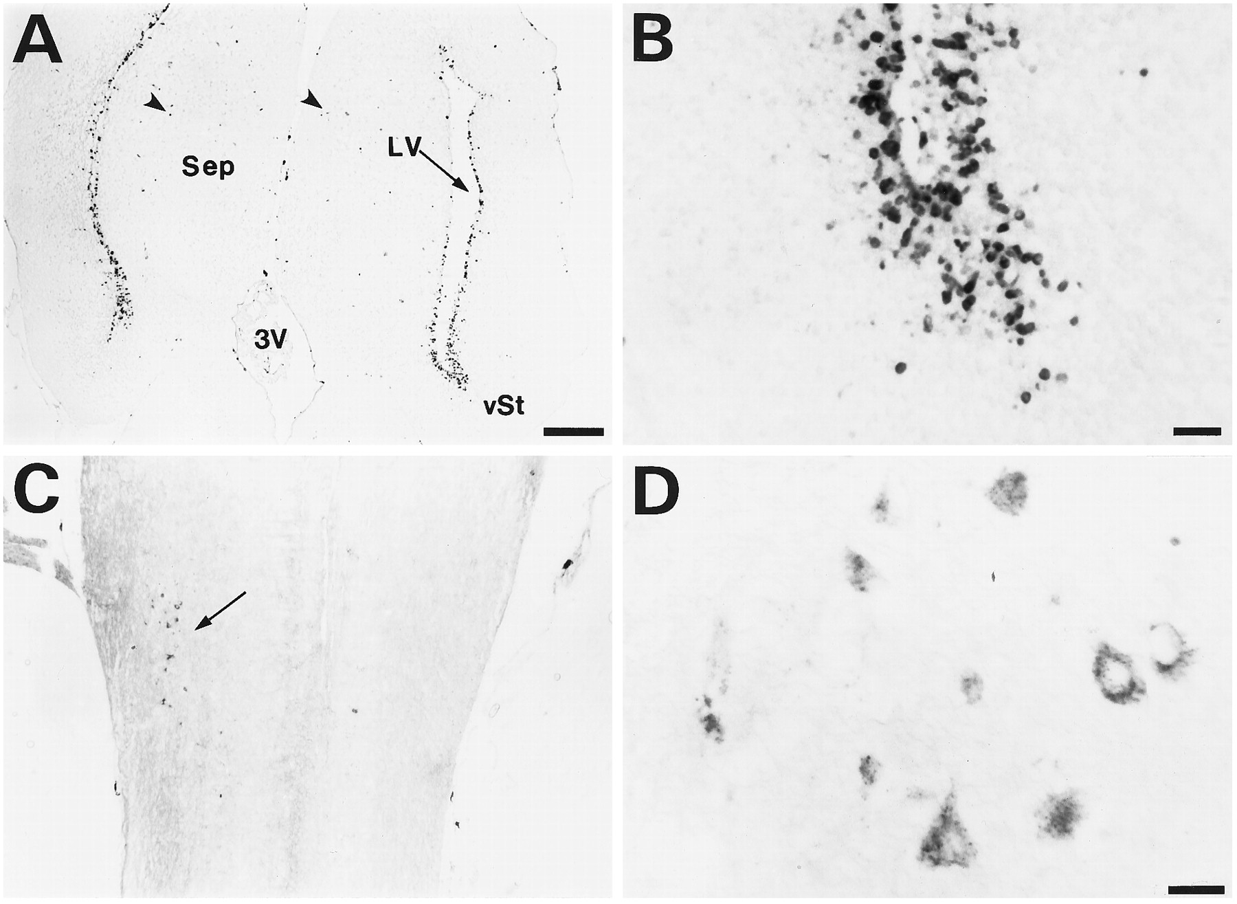 within the telencephalon and in cells in the ventralstriatum (vSt) and septum (Sep; arrowheads). 3V, Third ventricle. B, A higher magnification of