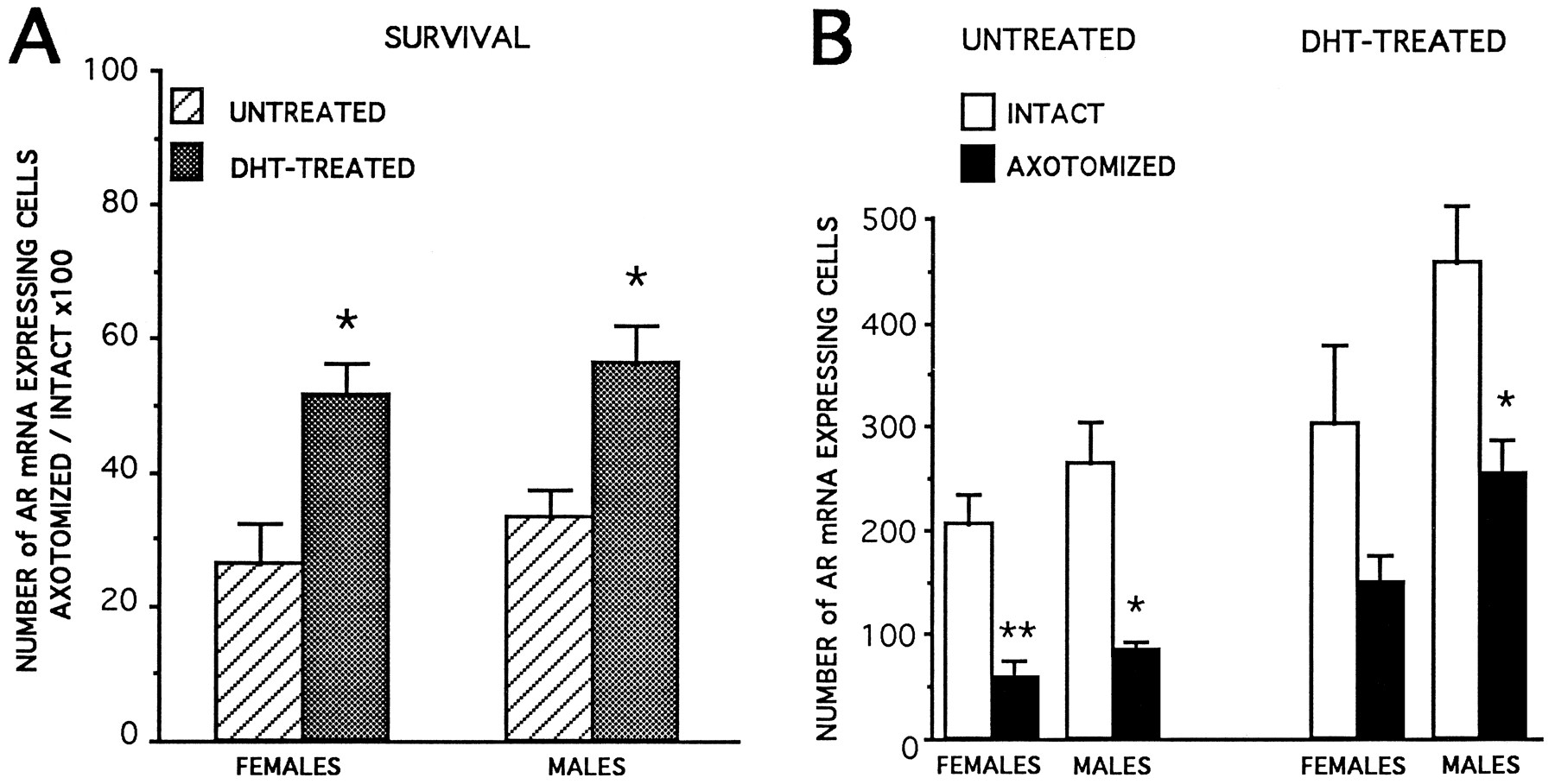 Figure 7. AR mRNA-expressing cells 5 months after axotomy. A, DHT treatment resulted in significantly more AR mRNA-expressing cells in the