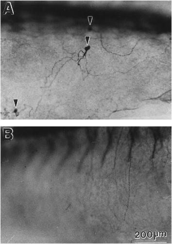 FIG. 8. The presence of ectopic neurons in the trunks of tadpoles expressing NF-MDT. 2-cell stage embryos were injected unilater-ally with NF-MDT mRNA and then stained as wholemounts at neustage 37/38 with the anti-NF-M tail antibody (RMO270, 1:200). Several ectopic cells with neuronal morphologies appeared on the injected side of the tadpole (arrowheads in A). These cells were absent from the uninjected side (B). The scale is the same for both panels.