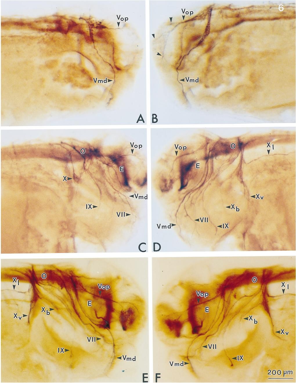 FIG. 6. Inhibition of cranial nerve development by NF-MDT. Embryos were injected unilaterally with either NF-MDT mRNA (A)or b-galactosidase mRNA (E, F) at the 2-cell stage and then immunostained with the anti-MAP1 antibody as wholemounts at stage 28 (A and B) or stage 37/38 (C ). (A, C, and E) The side of the animal derived from the injected blastomere. (B, D, and F) The respective contralateral uninjected side of the same animals. At stage 28, Vop (A, labeled arrowhead) developed to a lesser extent than on the contralateral, uninjected side (B). The unlabeled arrowheads in B show additional segments of Vop that are missing from the injected side. At stage 37/38 (C), cranial nerve development was more dramatically inhibited. (C) Inhibition of cranial nerves Vop, Vmd, VII, IX, and X. (D) Normal development of these same nerves on the contralateral side. Xb, Xv , and Xl are especially well developed on this side compared to the injected side. (E and F) Cranial nerve development was unaffected by expression of b-galactosidase. Cranial nerves on both sides of the head developed symmetrically, and the extent of nerve development was similar to that in D. (The dorsal side of the animals shown in E and F is rotated slightly forward.) Abbreviations: E, eye; O, otic vesicle; Vop , ophthalmic branch of the trigeminal nerve; Vmd, mandibular branch of the trigeminal nerve; VII, branch of the facial nerve; IX, branch of the glossopharyngeal nerve; Xb , brachial branch of the Xth cranial nerve; Xv visceral branch of Xth cranial nerve; Xl lateral line branch of the Xth cranial nerve. The scale bar applies to all panels.