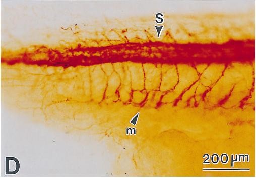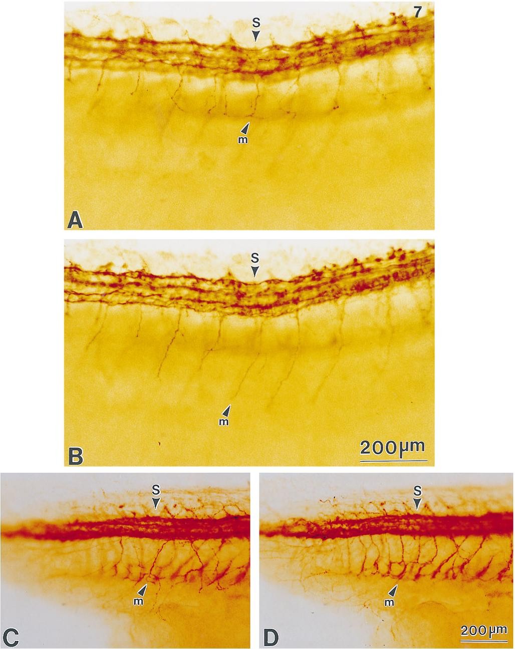 FIG. 7. Inhibition of primary motor nerve development by NF-MDT. Embryos were injected with NF-MDT mRNA into a single blastomere at the 2-cell stage and later stained as wholemounts with the anti-MAP1 antibody. (A) Lateral view of mid-level myotomes on the injected side of a stage 28 larval tadpole, showing inhibition of motor axon development. (B) The uninjected contralateral side of the same animal at the same rostrocaudal level as in A, showing normal motor nerve development. (C) Lateral view of tailsomites on the injected side of a stage 37/38 tadpole. (D) The contralateral uninjected side of the same tadpole as in C. The injected side (C) had fewer motor nerves emanating from the spinal cord than normal (D). Arrowheads at S point to the spinal cord. Arrowheads at m point to an example of a motor nerve projecting to the somites. In these panels, rostral is to the right. (The negatives were reversed when printed to maintain the same orientation in all panels.) The scale bars in B and D also apply to A and C, respectively.