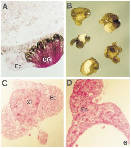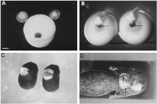 the E. coqui gastrula to illustrate the difference in size of these embryos. (B) E. coqui embryos with X. laevis cement glands. These anterior
