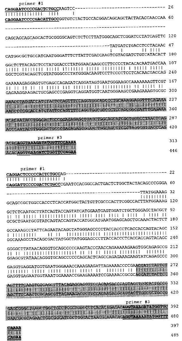fragments. The homeodomains are shaded. Dashes represent gaps