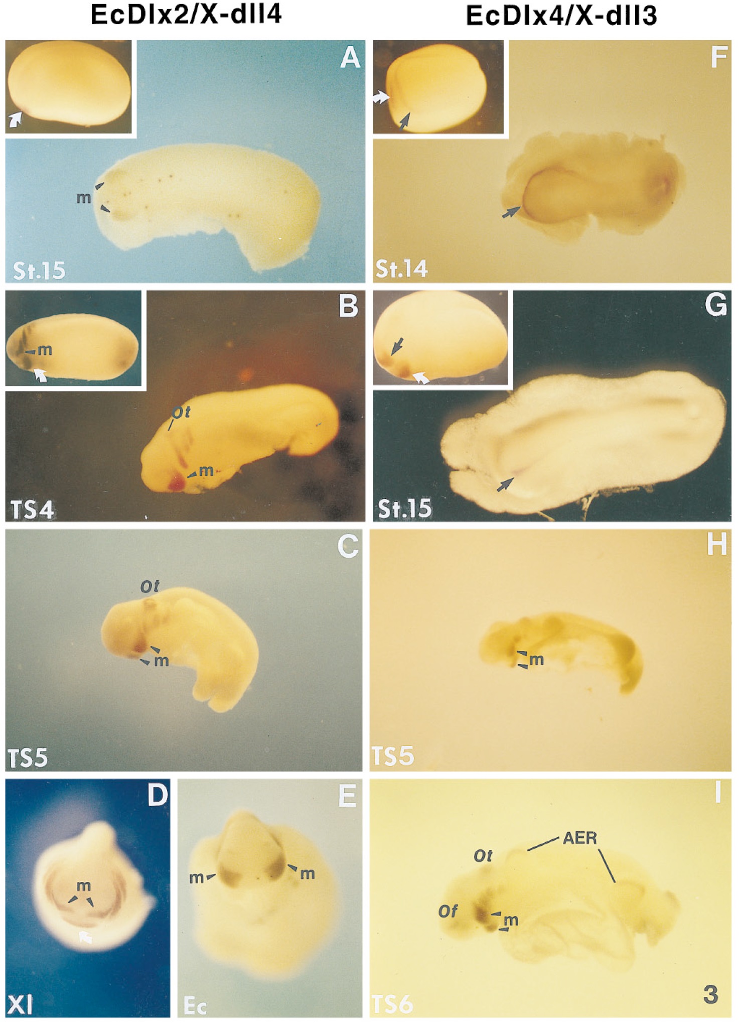 the mandibular streams (m) of neural crest cells. (A, inset) A homologous gene X-dll4 is expressed in the presumptive cement gland (white
