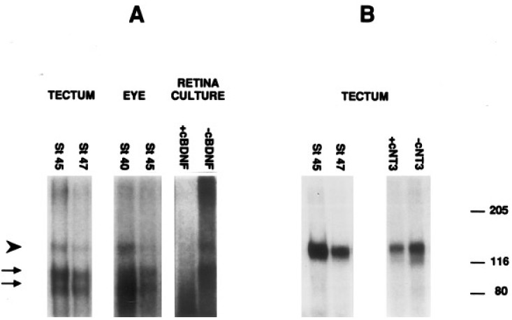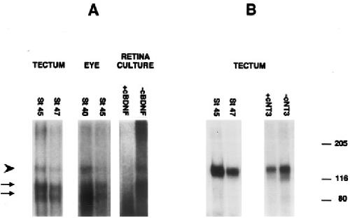 5. Detection of BDNF receptors by affinity cross-linking and immunoprecipitation. Membranes isolated from eyes, optic tecta,and