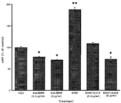 comparison, absolute numbers in NM/ 2% fetal calf serum are: control 865 { 44.3; Anti-BDNF (0.4 mg/ml) 642 { 6.9; Anti-BDNF (2 mg/