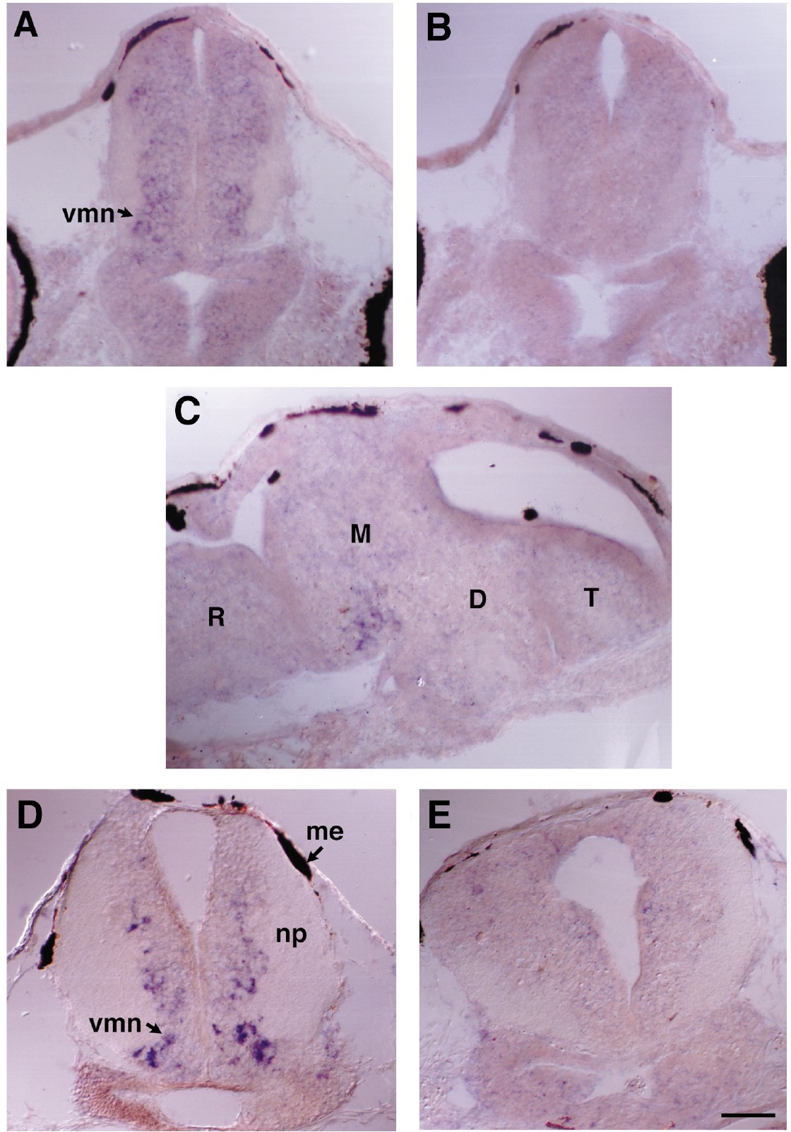 mesencephalic nuclei (vmn). (D) Hybridization of a stage 45 tadpole with the antisense BDNF probe shows specific hybridization in ventral