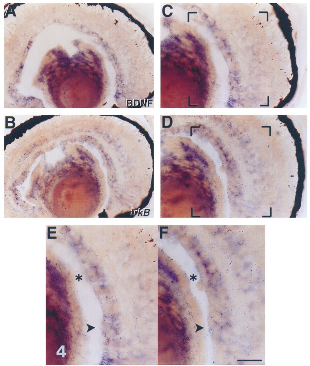 trkB (F) probes, respectively. The retinal areas outlined by the brackets in C and D are shown as high-magnification photomicrographs