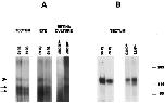 cultured retinal cells were incubated with 1 nM 125I-BDNF and cross-linked with EDAC. (A) A BDNF� receptor complex of approximately 140 kDa (arrowhead) can be readily identified in all samples, including cultured retinal cells. In addition, two bands of approximately 90 and 100 kDa (arrows) are seen. In all cases, all bands were specifically displaced by incubation with excess unla-beled BDNF (see Retina Culture; /cBDNF). (B) Immunoprecipita-tion of the cross-linked products with the 443 antibody to TrkB reveals a specific band of 140 kDa, identical to that observed in the