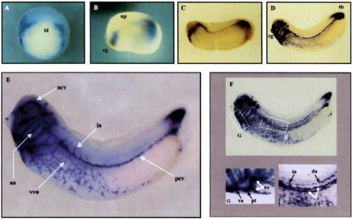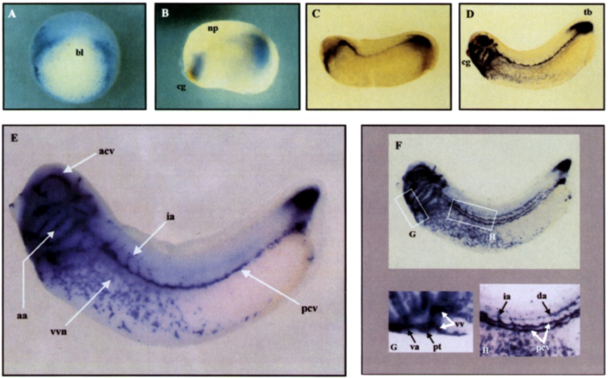 Fig. 4. Localization of X-mr gene expression by whole mount in situ hybridization. (A) Vegetal view of a gastrulaembryo. Note the strong labeling located in a horseshoe ring corresponding to involuting marginal zone, but the absence of labeling in the dorsal mesoderm above the blastopore lip (bl). (B) Lateral view of a neurula showing labeling in a ventral region close to the cement gland (cg), and in the dorsal part of the posterior region. A faint staining is observed in the lateral region, under the neural plate (np). (C,D) Lateral views of early larval stages with the head on the left and the back on the top. (E) Magnified view of an uncleared larva at stage 32-33. Note that the X-msr transcript is localized in vascular structures such as the anterior cardinal vein (acv), aortic arch (aa), intersomitic arteries (ia), the vascular vitelline network (vvn) and the posterior cardinal vein (pcv). (F) This larva is the one shown in E after clarification. Localization of the (G) and (H) magnifications are white-boxed. (G) Magnification of cardiac region. Note the labeling in the procardiac tube (pt) and its vascular extensions: ventralaorta (va) on the left and both vitelline veins (vv) on the right. (H) Magnitication of the lateral region, showing both lateralposterior cardinal veins (pcv), branched intersomitic arteries (ia) and dorsal aorta (da).