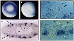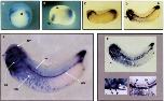 Fig 5. Embryonic origin of the cells expressing X-mu transcript. (A,B) Vegetal view of whole mount in situ hybridization of gastrulas from UV- ventralized (A) and lithium-dorsal&d (B) embryos, respectively. Note that the staining is localized all around the yolk plug in the ventralized embryo while it is absent in dorsalized embryo. (C) Thin transverse section from the anterior part of late neurula. Note that the labeling is exclusively localized in the lateral plate mesoderm (Ipm), and absent in axial and paraxial derivatives such as neural tube (nt), notochord (not), neural crest cells (nc) and somitic mesoderm (som). (D) Transverse section inside the branchial arches of a stage 32-33 embryo showing the labeling in the forming aortic arch (aa). Note also the staining in the retinal artery (ra) and in the anterior cardinal vein (acv). (E) Magnification of the branchial arches from (D), showing that cells of the visceral arches originating from the mesoderm are specifically labeled by the X-mu probe, whereas those deriving from endoderm (En) or neural crest (NCd) are unstained. Abbreviations: ar, archenteron; ph. pharynx; bv, brain vesicle.