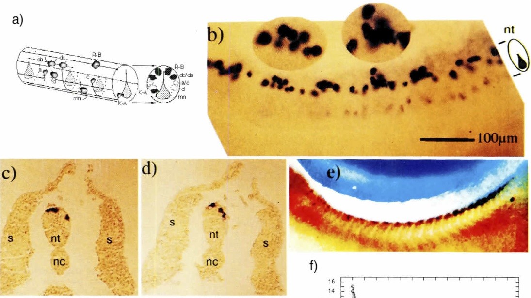 sensory neurons, K-A, Kolmer-Agduhr or ciliated ependymal neurons, de and da respectively, the dorsolateral commissural and dorsolateral ascending interneurons, a, d & c, respectively ascending. descending and commissural interneurons and mn, the motor neurons which mnervate the myotomes.lb) Detail of the xTrkB e,xpression in the neural rube of a stage 33/34 embryo. A lateral vlewof the region between somites 4 and 9. post-otic, is shown with insets at 2x higher magnification; anterior is to left, dorsal up. The position of the neural rube, nt, is Indicated. (c and d) Transverse cross-sections taken at mid-trunk after whole-mount hybridization. The notochord, nc, neural tube. nt, and somltes. s, are indicated. lei Lateral view of an uncleared embryo showmg the relative positions of somire segmenrs and TrkB posirive cells, anterior is to lefr, dorsal up. If) Analysis of rhe numbers of x TrkB-positive dsc celfs within different segmenrs. Numbers are given per segment. per side and somites are idenrified by their number post-otic. HB refers to the hindbrain region. Open circles indicate data from 4 embryos (6 counted ganglia) at stages between 30 and 34 while solid squares give data from a single stage 24 embryo. The shaded area indicates the standard deviation of the stage 30 to 34 data.