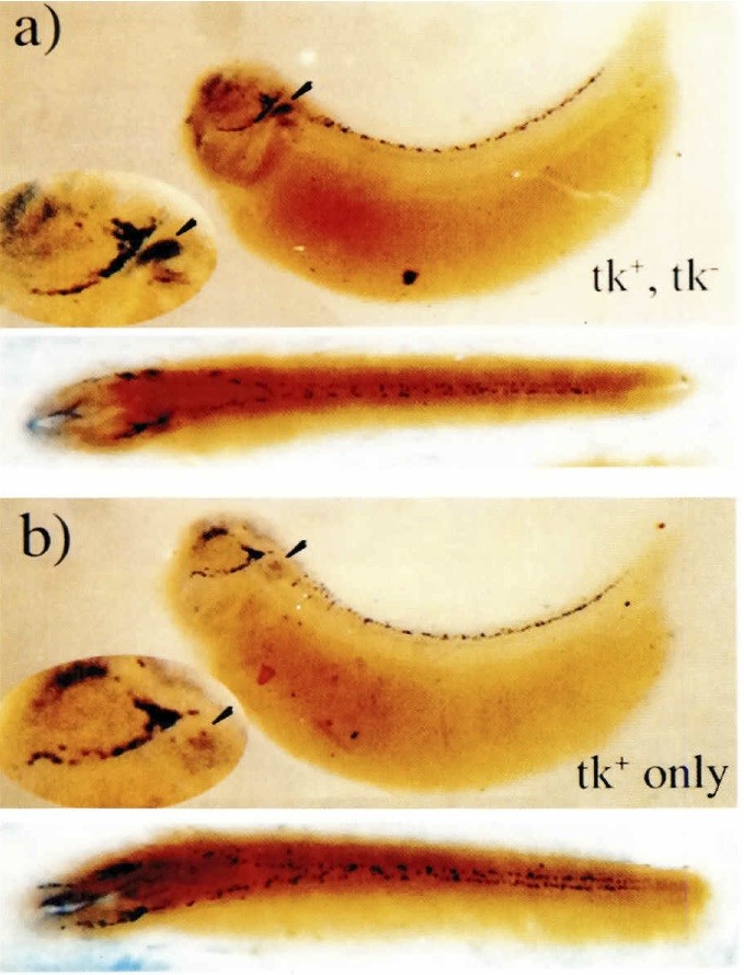 facial ganglion regions and the arrow indicates inla) rk- mRNA wirhin the facial ganglion and in (bl the presumed region of the facia! ganglion ina tk+ stained embryo. Differences in staining of the anterior crania! regions and otic vesicle between whole-mount samples were observed (e.g. compare Fig. 8a and b with 6bJ. These differences did not correspond to discrete celfular staining nor did they correlate wIth given probes and were most probably due to non- specific staining in cranial cavities.