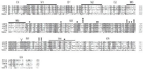 and intradiscal domains are indicated by C#, M# and D#, respectively. Identical residues are indicated by the shaded boxes. Amino