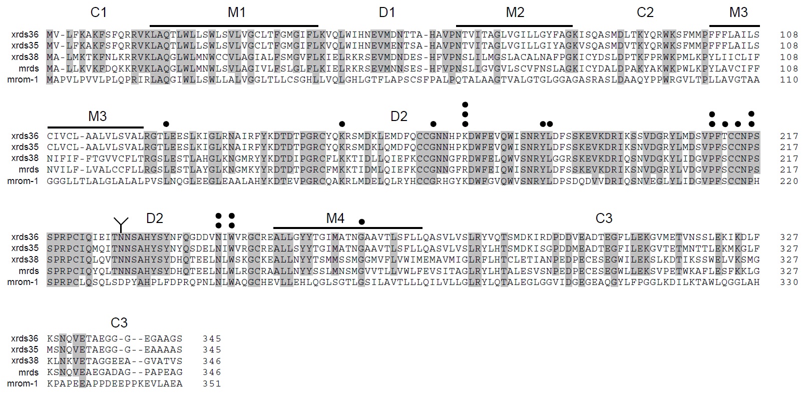 Fig. 1. Amino acid sequences of xrds36, xrds35 and xrds38 aligned with mouse rds/peripherin and rom-1. The cytoplasmic, membranespanning,
