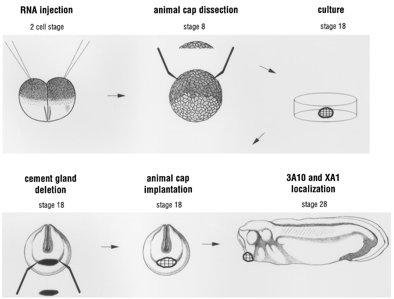 FIG. 5. Schematic of the animal cap substitution assay. This depicts the strategy used for the assay. In vitro transcribed RNAs are injected in the animal pole of both blastomeres of 2-cell stage embryos. Animal caps of blastula stage embryos (stage 8) are cut and cultured in 0.51 MMR until sibling embryos reached neurula stage 18. Animal caps are then bisected and substituted for the cement gland in stage 18 embryos. These experimental embryos are fixed at tailbud stage 28; 3A10 staining and XA-1 in situ hybridization are then performed. |