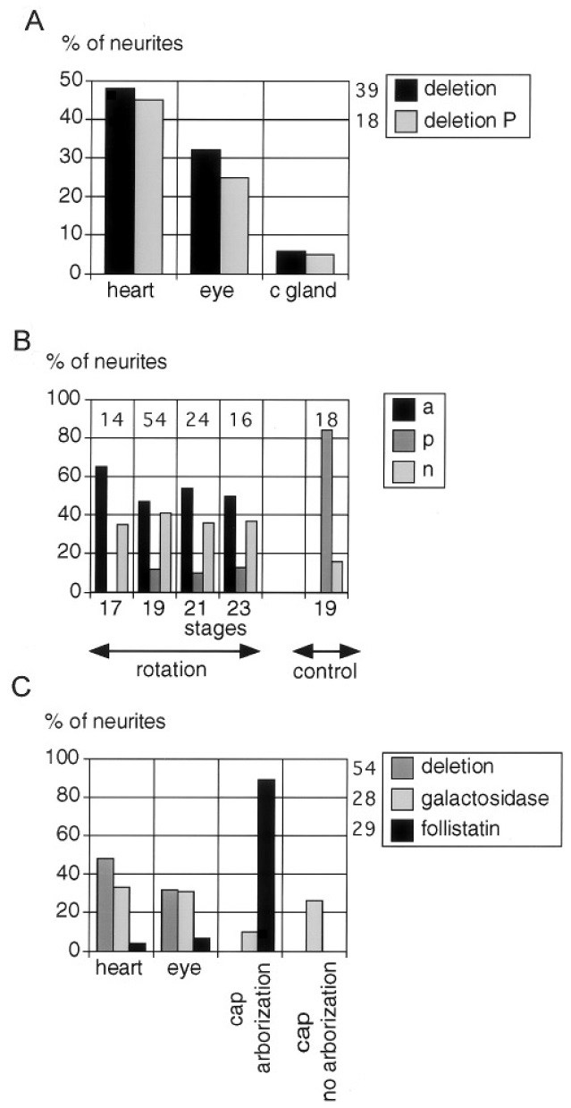 FIG. 7. Quantification of neurite behavior. (A) Trigeminal neurite behavior in embryos lacking their target. Percentage of neurites (whole nerve) with no arborization and extending toward the heart or the eye or stopping at the original site of the cement gland are shown after a complete deletion (deletion, n  39) or after partial posterior deletion (deletion P, n  18) of the cement gland. (B) Consequence of rotation performed at different embryonic stages on the behavior of the mandibular trigeminal neurites. Arborization of trigeminal neurites in the posterior (p) and the anterior (a) sides of the cement gland are indicated. (n) Embryos with no terminal arborization. (control) Embryos from which the cement gland is removed at stage 19 and reimplanted in its initial AâP orientation. Numbers of embryos are indicated at the top of the histogram. (C) Follistatin induces ectodermal explants to express cues controlling trigeminal neurite behavior. b-Galactosidase RNA is used as con- trol for RNA injection. Percentage of neurites without arborization extending toward the heart (heart), the eye (eye), or the animal cap (cap no arborization) are shown. The percentage of neurites forming a terminal arborization in the animal cap is shown (cap arborization). Numbers of embryos are indicated to the left of the legend. |