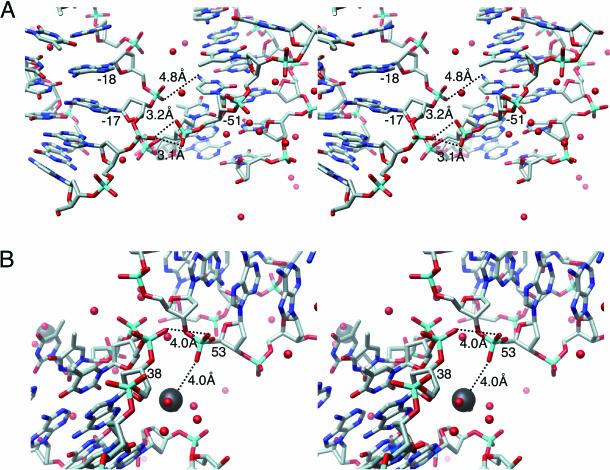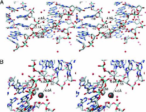 Figure 5. Details of the DNA–DNA contact within the human NCP crystal. (A) Detailed stereo view of the DNA–DNA contact shown in Figure 4B and C. (B) Detailed stereo view of the DNA–cation–DNA contact shown in Figure 4D. All of the atoms of the DNA duplexes are shown as normal sticks, where the phosphorus, oxygen and nitrogen atoms are colored cyan, red and blue, respectively. The Mn2+ ions and the water molecules are depicted by black and red balls, respectively. Broken lines and distances between two atoms show possible interactions through water molecules. Numbers presented for each base pair are the same as those in Figure 2A.
