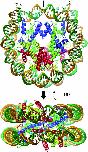 Figure 1. The overall structure of a human NCP. The upper ribbon model is the crystal structure of a human NCP. The arrow above NCP indicates a pseudo 2-fold axis passing through the center of the structure. The bottom figure displays the axial view of the particle. Histone chains are colored blue for H3, green for H4, yellow for H2A and red for H2B. The DNA is shown in ribbon traces for the 146 bp DNA phosphodiester backbones (brown for the I chain and forest green for the J chain). The Mn2+ and Cl− ions are depicted by cyan and silver balls, respectively.