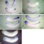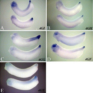 Fig. 4. Expression from a 5′ deletions series in transgenic embryos. This figure shows the expression in transgenic tailbud stage embryos from a series of 5′ deletion constructs visualized by hybridization against GFP RNA. The 4GI, 4GH, 4GG, 4GF, and 4GE constructs contain, respectively, 2245, 1750, 1370, 750, and 237 bp of sequence upstream of the transcriptional start site. In all panels, anterior is to the left. Panels A, B, C, D, and E show the expression of constructs 4GI, 4GH, 4GG, 4GF, and 4GE, respectively.