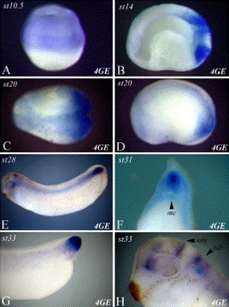 Fig. 5. Expression from the 4GE 5′ deletion construct in transgenic embryos. This figure shows the expression in transgenic embryos of the 4GE 5′ deletion construct at various stages visualized by hybridization against GFP RNA. 4GE contains 237 bp of sequence upstream of the transcriptional start site. In panels B, C, D, E, G, and H, anterior is to the left. Panel A is a lateral view of a gastrula stage 10.5 embryo. Animal is to the top. Panel B is a sagittal section through an early neurula stage 14 embryos. Panel C is a dorsal view of a late neurula stage 20 embryo. Panel D is a lateral view of stage 20 embryo. Dorsal is to the top. Panel E is a lateral view of a tailbud stage 28 embryo. Panel F is a transverse section through the posterior trunk of a tailbud stage 31 embryo. Panel G is a lateral view of the tail-forming region from a stage 33 embryo. Panel H is a lateral view of the head of a tailbud stage 33 embryo. mhj = midbrain/hindbrain junction, hdb = hindbrain, ntc = notochord.