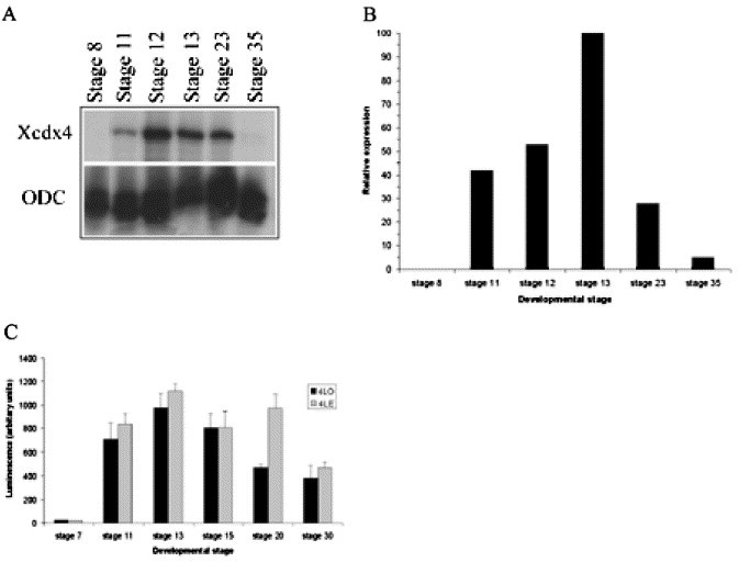 Fig. 6. Quantitative analysis of Cdx4 and reporter construct expression. Panel A is an autoradiograph of an RNAse protection analysis of Cdx4 gene expression during development. 10 μg total RNA from each stage was hybridized with probes for Cdx4 and ODC. Panel B is a chart showing the relative expression of Cdx4 at the same stages as determined by densitometry. Cdx4 expression was normalized to ODC expression and represented as a percentage of the maximum expression at stage 13. Panel C shows the relative luminescence detected from embryos injected with the 4LO and 4LE firefly luciferase reporter plasmids during development. The 4LO and 4LE constructs, respectively, contain 2833 bp and 237 bp upstream of the transcriptional start site. The firefly luminescence was normalized to the luminescence produced by the coinjected CMV-Renilla luciferase control plasmid.