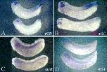 Fig. 7. Expression from a 5′ deletion series of the proximal promoter region in transgenic embryos. This figure shows the expression in transgenic tailbud stage embryos from a series of reporter constructs containing 5′ deletions of the proximal promoter region of Cdx4 visualized by hybridization against GFP RNA. The 4GD, 4GC, 4GB, and 4GA constructs contain, respectively, 187, 92, 63, and 24 bp of sequence upstream of the transcriptional start site. In all panels, anterior is to the left. Panels A, B, C, and D show the expression of constructs 4GD, 4GC, 4GB, and 4GA, respectively.