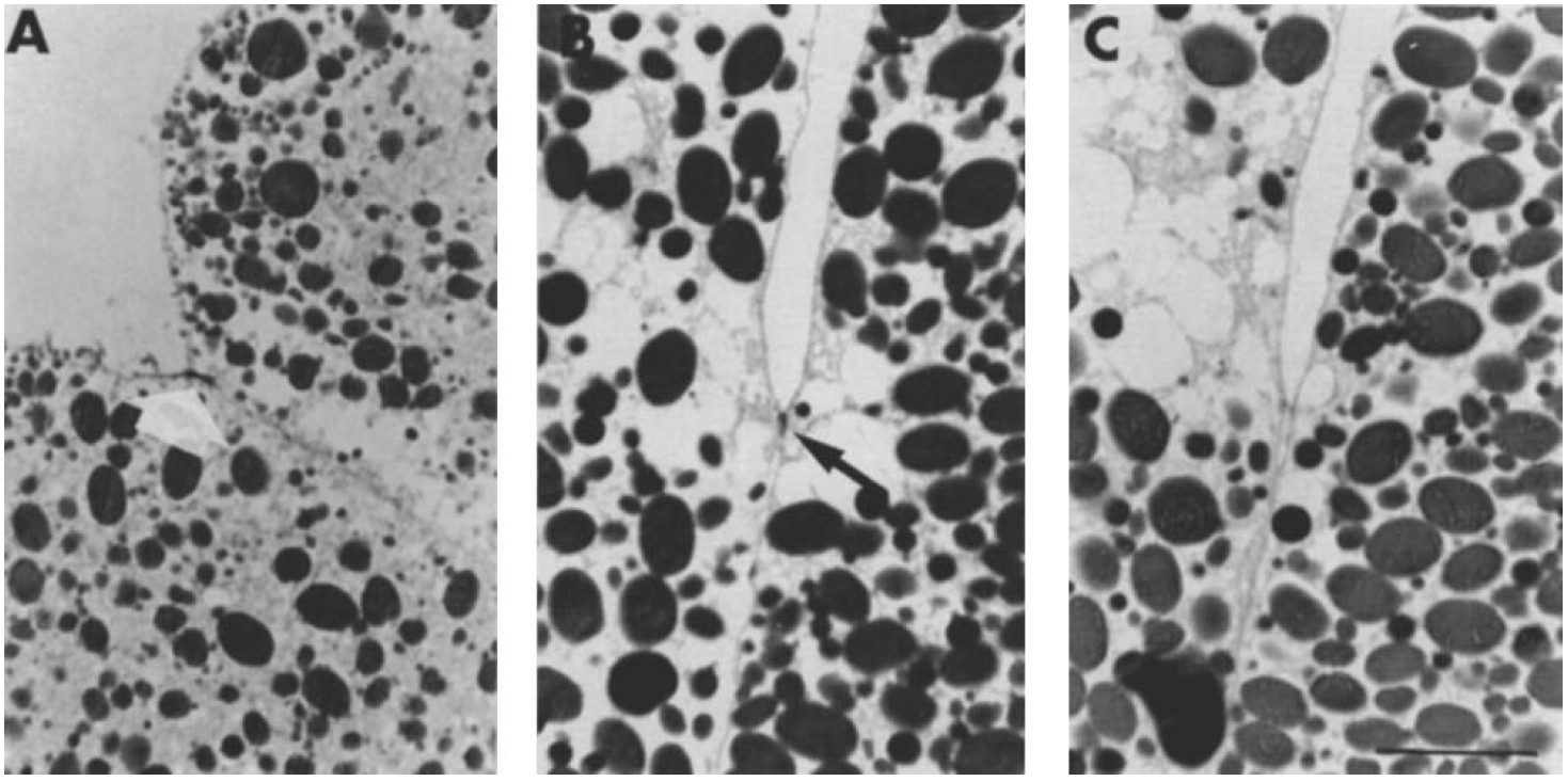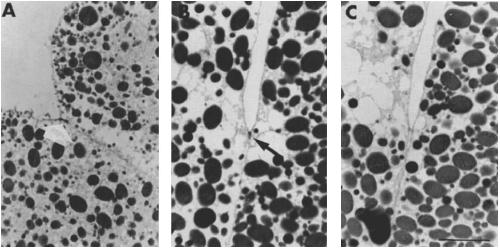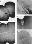 and control (C). Arrows in A and B indicate staining accumulated in the apical junctional regions. Bar = 20 um.