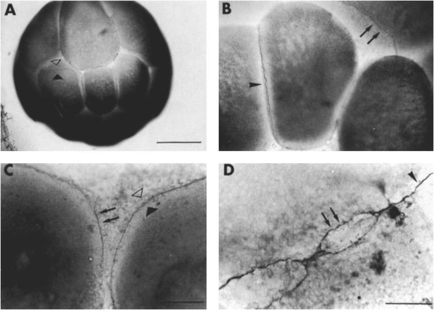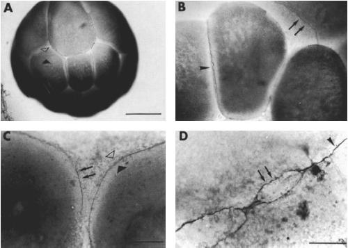 cingulin labeling in dissociating, newly divided blastomeres. Arrowhead in