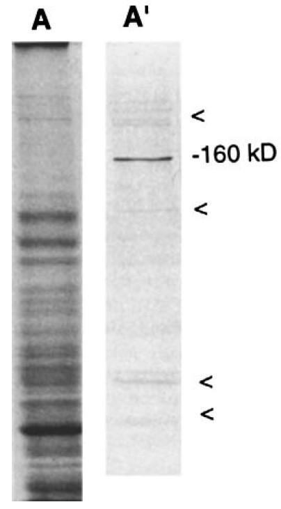 Coomassie-stained SDS-PAGE (A) and corresponding immunoblot (A')