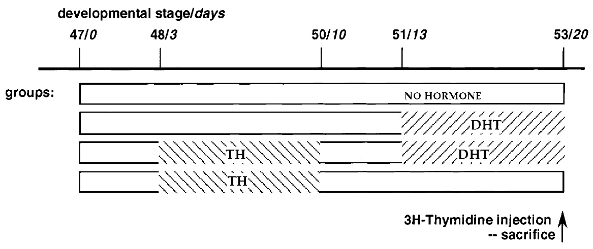 or dihydrotestosterone (DHT). All tadpoles received an injection of [3H]thymidine at stage 53 and were killed 30 min later.