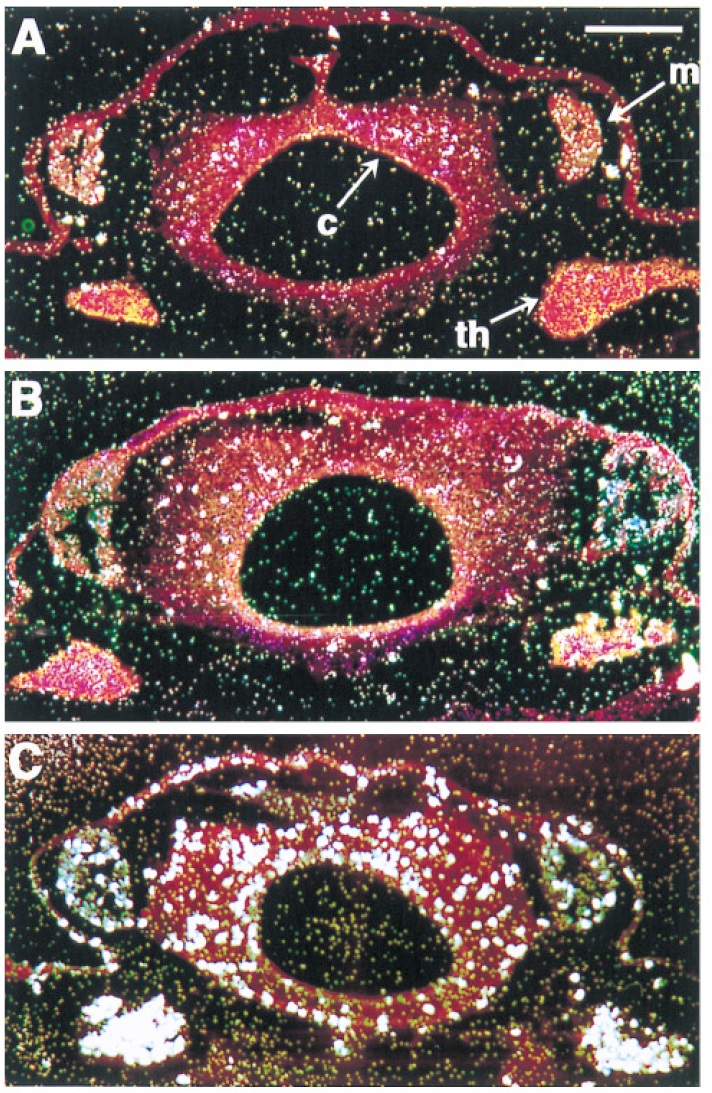 FIG. 7. Hormone receptor gene expression in tadpole (AâC) and explant (Dâ F) larynges. Sections were hybridized in situ to S35 riboprobes