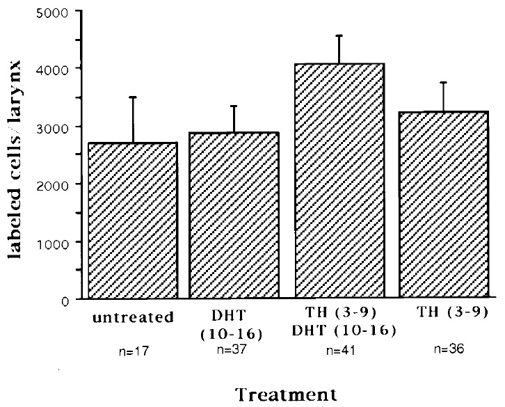 FIG. 4. The effects of hormone treatments on laryngeal cell proliferation in PM2 juveniles. The number of labeled cells/total number