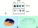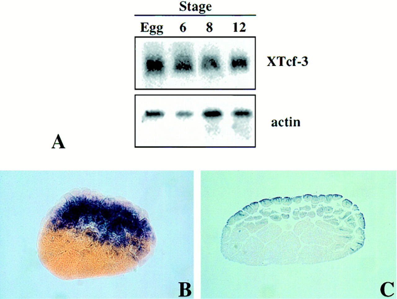 (B and C) In situ hybridization for XTcf-3 expression in early embryonic stages. (B) shows a stage-7 cleared embryo, viewed laterally. (C) shows a section of a stage-7 embryo.