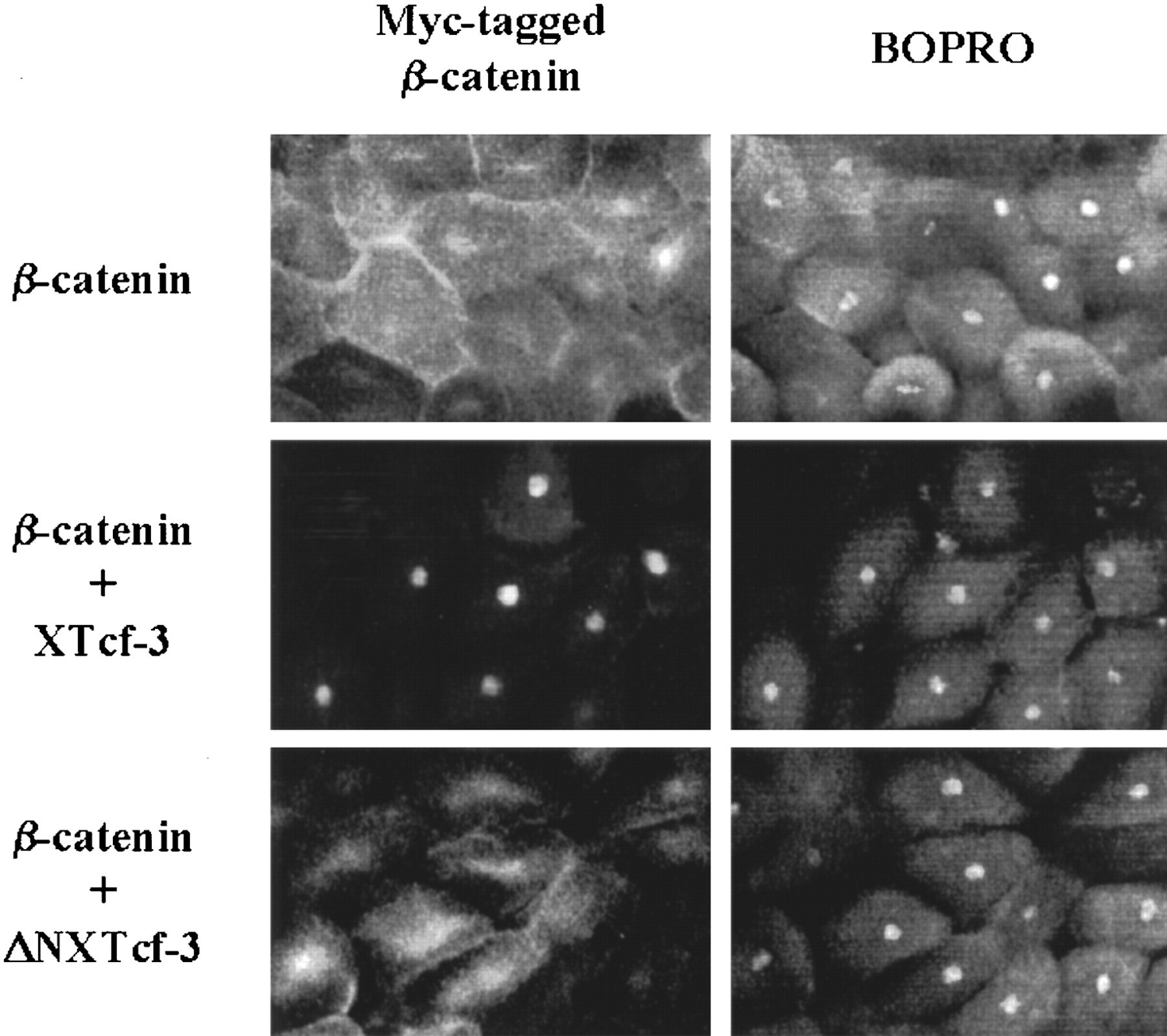 Stage-7 pre-MBT Xenopus embryos, analyzed by whole-mount immunohistochemistry. Three optical sections (Z-step, 5 μm) were projected onto each other for each picture. At left are the following: Myc-tagged β-catenin mRNA was injected alone (500 pg of RNA) (top) or in combination with 250 pg of RNA encoding wild-type XTcf-3 (middle) or ÎN (bottom). β-Catenin was visualized by staining for the Myc tag. Corresponding BO-PRO-3 nuclear staining is shown to the right.