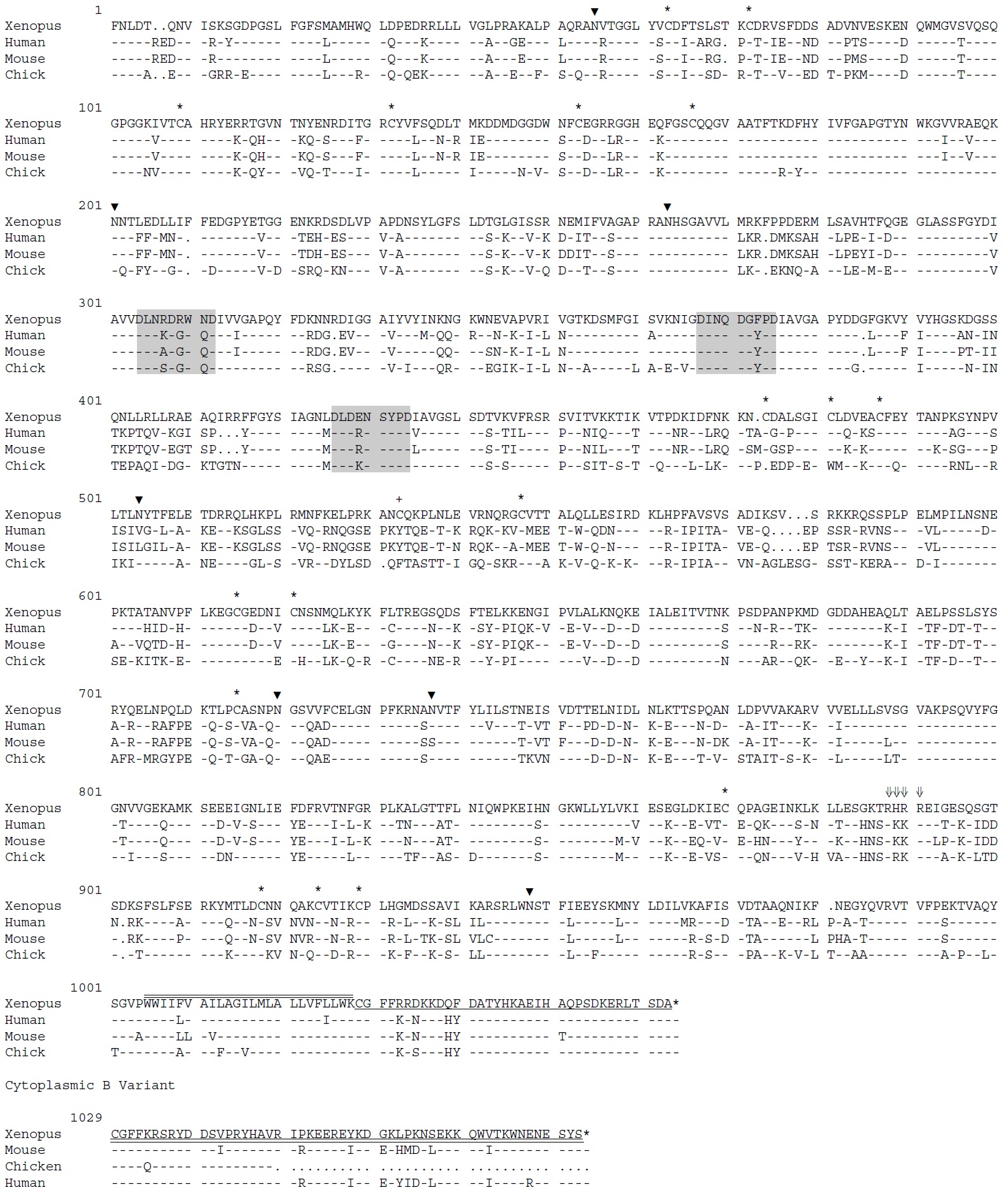 by underline, and the B cytoplasmic domain by double underline.