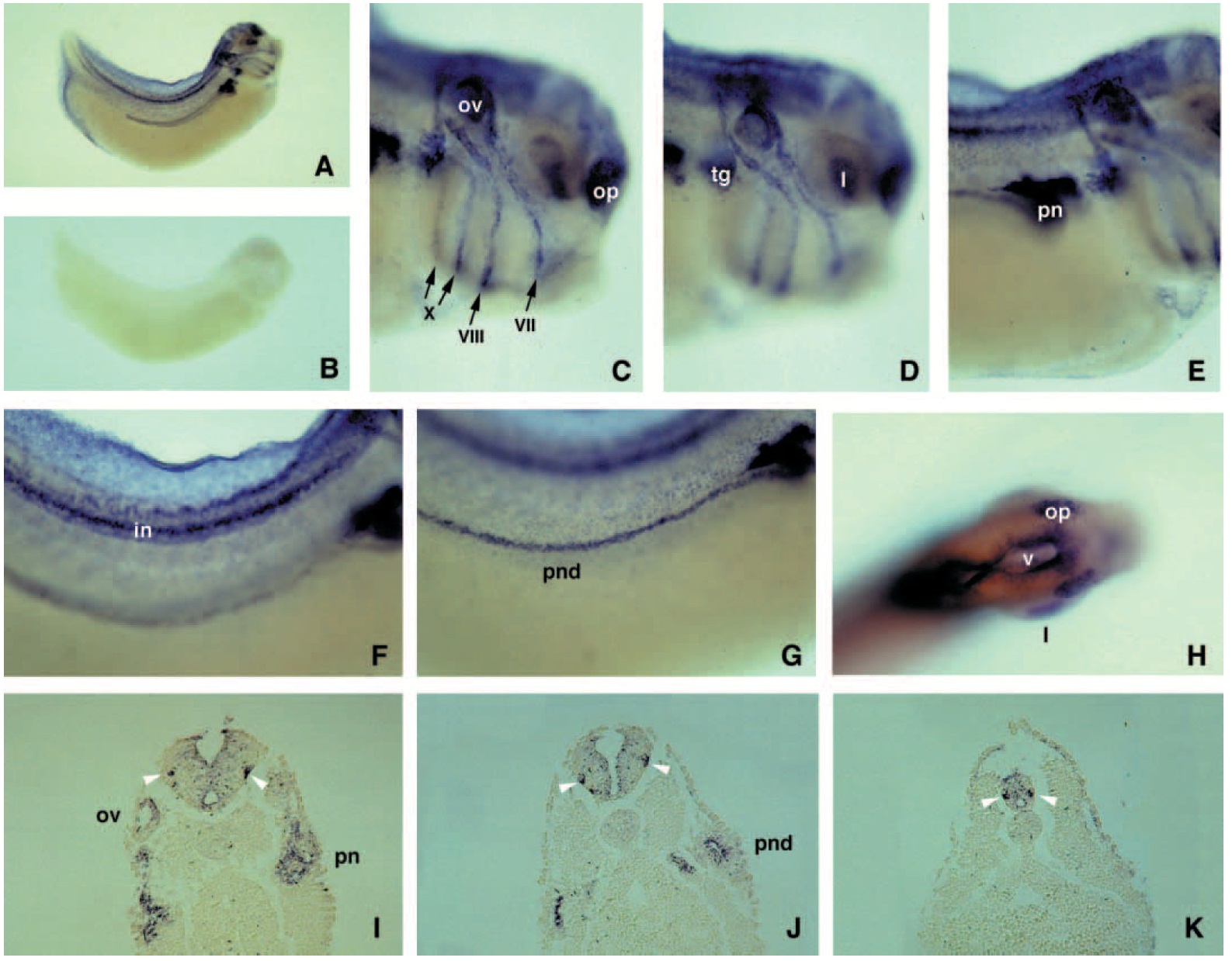 otic vesicle (ov) and within the pronephros (pn), and (J) more caudally in the pronephric duct (pnd). |