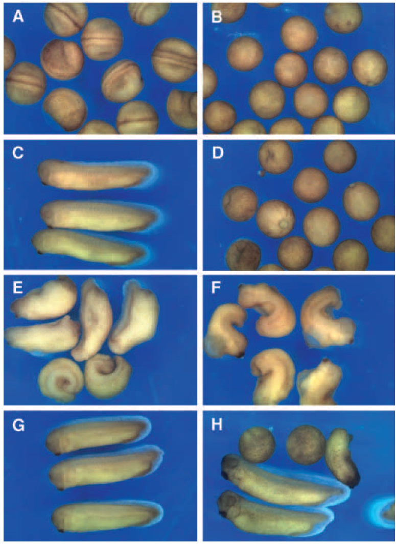Control embryos develop normally to early neurula (A, stage 16) and