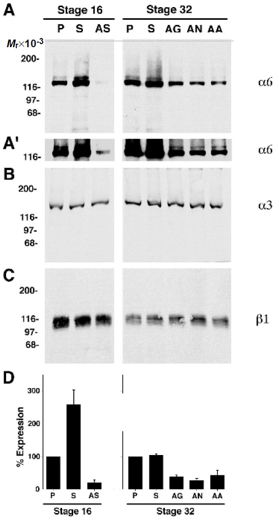 expressing antisense a6 RNAs. Protein levels for the integrin (A) a6,