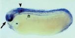and optic lobe (arrow), as well as the notochord (n). (F) Longitudinal view of similar stage embryo reveals that expression in the neural tube is