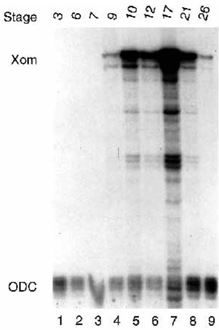Fig. 2. RNAase protection analysis of Xom expression. Xom