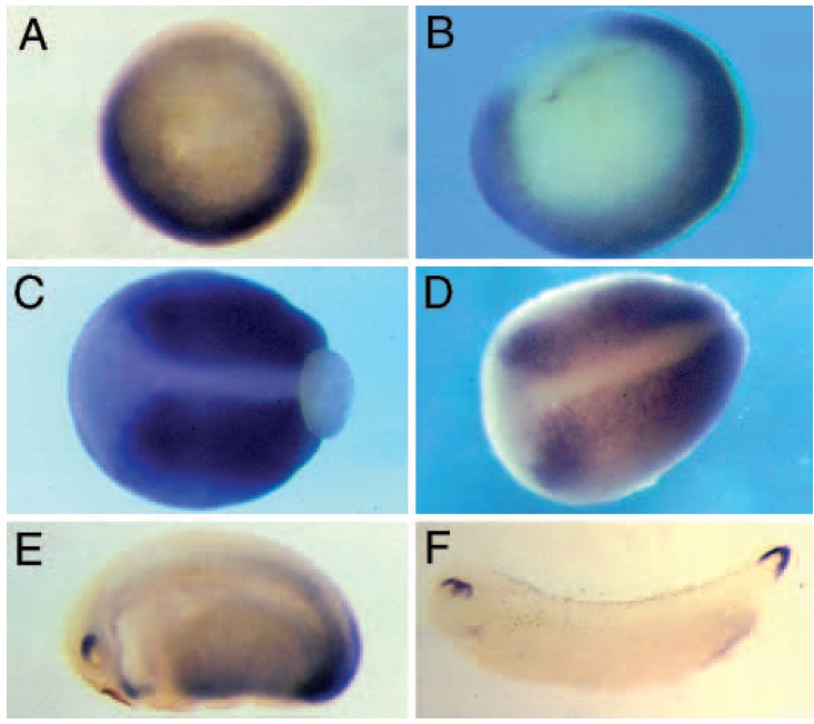 view of a Xenopus embryo at stage 9 shows asymmetric expression