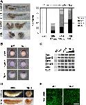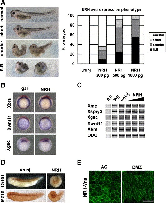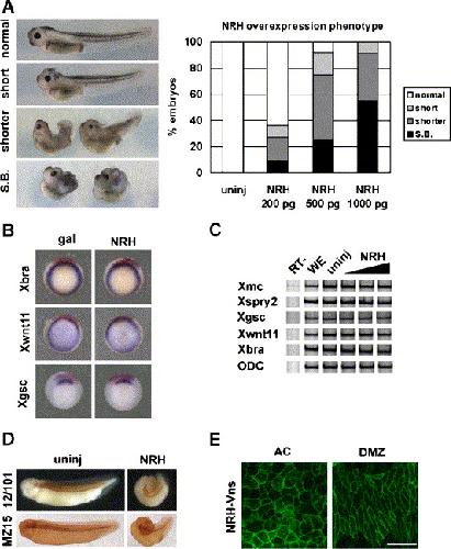 Fig. 1. Gain of NRH function induces severe gastrulation defects but does not affect transcription regulation. (A) Embryos received an NRH mRNA injection (200 pg (n = 67), 500 pg (n = 75), and 1000 pg (n = 73)) in two dorsal cells at the 4-cell stage were classified into short or shorter anteroposterior (A�P) axis and spina bifida (S.B.). Embryos whose A�P axis was shortened compared with uninjected embryos (n = 70) were further classified into two categories according to the severity of the phenotype: that is, embryos were categorized as having a short A�P axis (short) or a very short A�P axis (shorter). (B) Whole-mount in situ hybridization (WISH) analysis was performed with a lineage tracer that was introduced into two dorsal cells at the 4-cell stage. Mesodermal markers Xbra and Xwnt11 and the presumptive head marker Xgsc were used in the WISH analysis. (C) Semi-quantitative RT-PCR analyses were carried out to obtain molecular clues regarding the role of NRH in mesodermal induction and the FGF signaling pathway. Primer pairs for known non-canonical FGF target genes, Xspry2 and Xmc, as well as canonical FGF target genes, Xbra and Xwnt11, were used in this assay. (D) In later stages, embryos that received the NRH mRNA injection were stained with 12/101 antibody (somites) or MZ15 antibody (notochord). There was no change in the differentiation of the somites and the notochord. (E) The subcellular localization of NRH was examined using the C-terminal Vns-tethered construct (100 pg) in dissected animal cap (AC) and involuting dorsal marginal zone (DMZ) explants. The subcellular localization was visualized by confocal microscopy. Scale bar, 100 μm |
