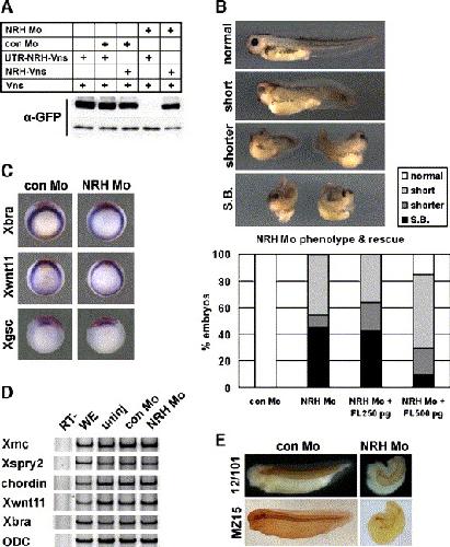 Fig. 2. NRH is required for convergent extension cell movements. (A) We confirmed that the NRH Mo specifically inhibited NRH mRNA translation. ACs received a co-injection of antisense morpholino oligonucleotides (Mos) (16.8 ng) and Venus-tagged constructs (100 pg) and Venus (100 pg). The ACs were then isolated and the constructs were detected by with an anti-GFP antibody. We confirmed both that the NRH Mo completely abolished translation of the NRH construct that included the 5′ UTR, and that this inhibition was fully rescued by the Venus-tagged NRH full-length (FL) construct. (B) Embryos whose NRH was depleted (n = 82) displayed gastrulation defects, spina bifida or a short trunk, and those phenotypes were compared with embryos that received injections of the control Mo (con Mo) (n = 80). These phenotypes were partially rescued by the co-injection of 500 pg (n = 78) but not 250 pg (n = 75) of FL NRH mRNA. (C, D, E) NRH Mo-injected embryos showed no difference from normal embryos in their mesodermal induction or expression of FGF signaling components. In addition, staining with the 12/101 antibody (somites) and the MZ15 antibody (the notochord) clearly showed that NRH did not alter the mesodermal development. |