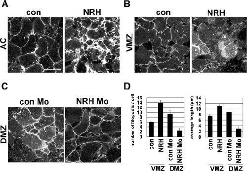 Fig. 4. NRH is essential for the regulation of cell morphology. Scale bar, 50 μm. (A, B) Cell shape changes in ACs and VMZ (ventral marginal zone) cells in response to changes in NRH expression. ACs or VMZs received injections of NRH mRNA (500 pg) and membrane-bound RFP (150 pg) into two animal cells at 2-cell stage embryos and two ventral cells at 4-cell stage embryos, respectively. ACs were cultured on glass-bottomed dishes and VMZ cells were cultured on fibronectin (0.1 mg/ml)-coated glass-bottomed dishes. In ACs expressing exogenous NRH, the number, length, and thickness of protrusions were remarkably increased. (C) DMZ cells received an injection of con Mo (16.8 ng) or NRH Mo (16.8 ng) in the two dorsal cells at the 4-cell stage to study NRH Mo-induced cytoskeletal changes. Membrane-bound RFP (150 pg) was co-injected to mark the cell membrane. (D) Using NIH image processing software, we counted the number of filopodia per one cell and measured the length of filopodia to assess an effect of NRH and NRH Mo in cell morphology. NRH mRNA injection received VMZ cells showed not only over 2 times increased number of filopodia per cell but also much longer average length of filopodia than those of mb-RFP injection received VMZ cells (con). At the same time, NRH Mo introduced DMZ cells exhibited almost 3 times smaller number of filopodia per cell and shorter average length of filopodia than those of con Mo-injected cells. |