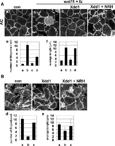 Fig. 6. NRH could rescue perturbed non-canonical Wnt/PCP pathway-driven protrusive morphology. Scale bars, 50 μm. (A) Exogenous co-injection of Xwnt11 and Xfz7 into animal cells (200 pg each, b) was capable of producing well-developed filopodia in animal cells and these protrusions were almost completely suppressed by Xdd1 (1000 pg, c), PDZ domain deleted form of Disheveled. NRH mRNA (400 pg) could partially recover filopodia formation in number (e) but almost fully in average length of filopodia (f). (B) All mRNAs were injected into two dorsal cells at 4-cell stage embryos. Filopodia of DMZ (a) were suppressed by Xdd1 introduction (b) both in number (d) and average length (e) and those effects by Xdd1 were restored by NRH co-injection (c) though they were partially rescued (d, e). |