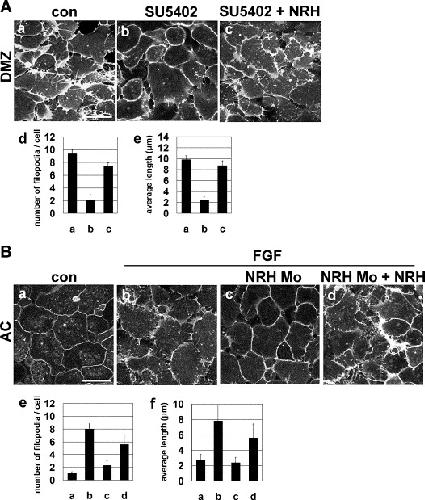 Fig. 8. FGF signaling is responsible for filopodial formation via its target gene, NRH. Scale bar, 50 μm. (A) DMZs were isolated at the early gastrula stage and cultured on fibronectin-coated glass-bottomed dishes. Control DMZs that expressed membrane-bound RFP (150 pg) showed well-developed filopodial extension (a). These protrusions were completely abolished when the FGFR-specific inhibitor, SU5402 (50 μM), was added to the culture medium (b, d, e). Nevertheless, NRH mRNA (400 pg) rescued the inhibitor-induced filopodial defect both in number and average length (c, d, e). (B) The addition of bFGF (50�100 ng/ml) to membrane-bound RFP (150 pg)-expressing AC cells led to a marked increase both in the number and in the average length of cellular protrusions (b, e, f). The formation of filopodia was dramatically suppressed when the NRH Mo (16.8 ng) was introduced (c, e, f). However, the effect of the NRH Mo was reversed with the co-injection (400 pg) of FL NRH mRNA that lacked the 5′ UTR (d) though the number of filopodia and average length of filopodia were not higher than those of con Mo-introduced cells (e, f). |
